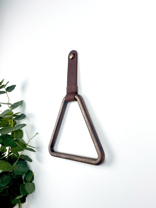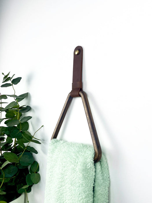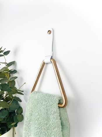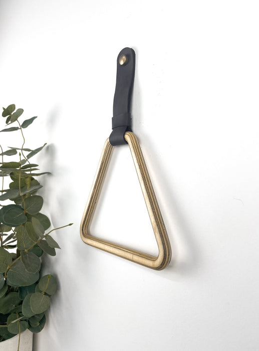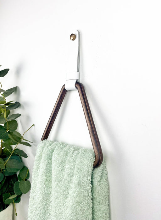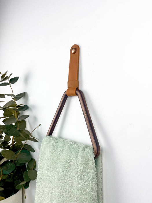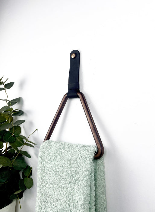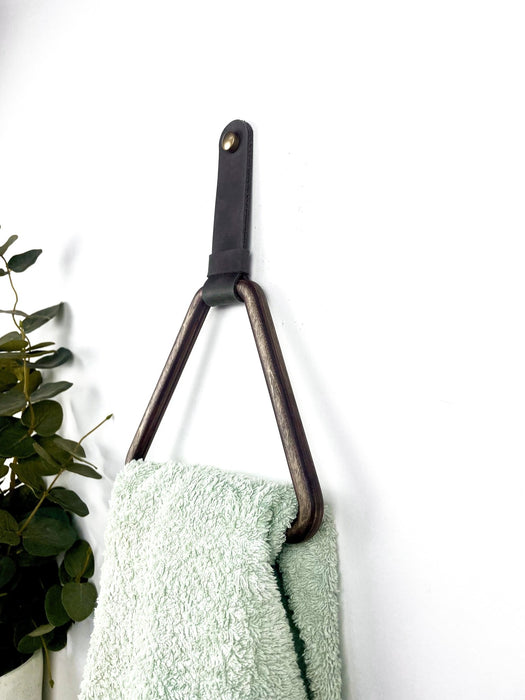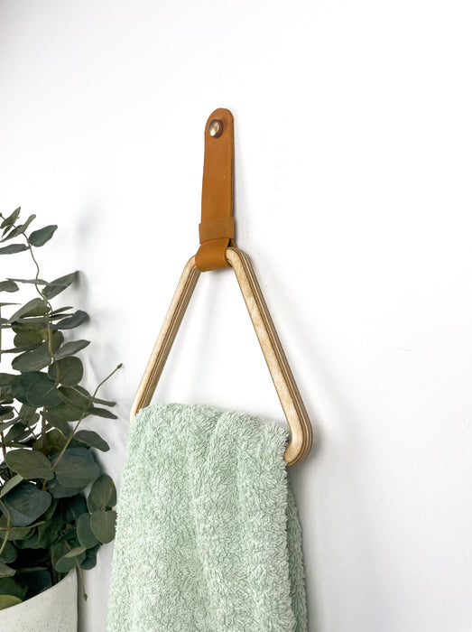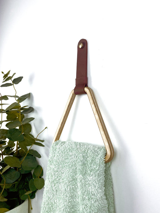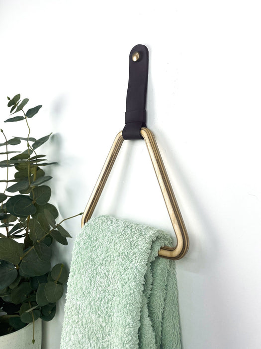 Elevate your bathroom with this handcrafted geometric towel holder, made from wood and genuine leather. The minimalist triangle shape adds a touch of natural elegance while keeping your hand towels neatly in place. Ideal for modern, Scandinavian, or rustic interiors. Easy to mount and beautifully simple — a perfect balance of style and function.