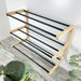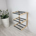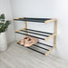 The shelves are constructed with aluminum tubes finished in matte black powder coating. This combination of materials ensures exceptional longevity: aluminum is resistant to corrosion and unaffected by moisture from wet footwear, making the rack highly practical for everyday use.